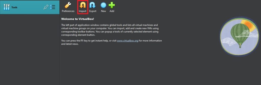 After that, launch VirtualBox, if this has not been done before, and click the Import button in the interface.
