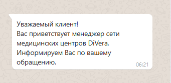 Клиент оставляет заявку и контактные данные на сайте, чтобы записаться на прием или получить консультацию клиники. С ним связывается менеджер и отправляет шаблонное сообщение, после чего стороны договариваются о времени и месте посещения специалиста.