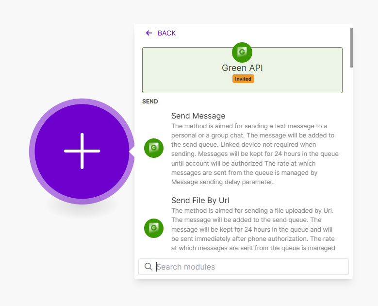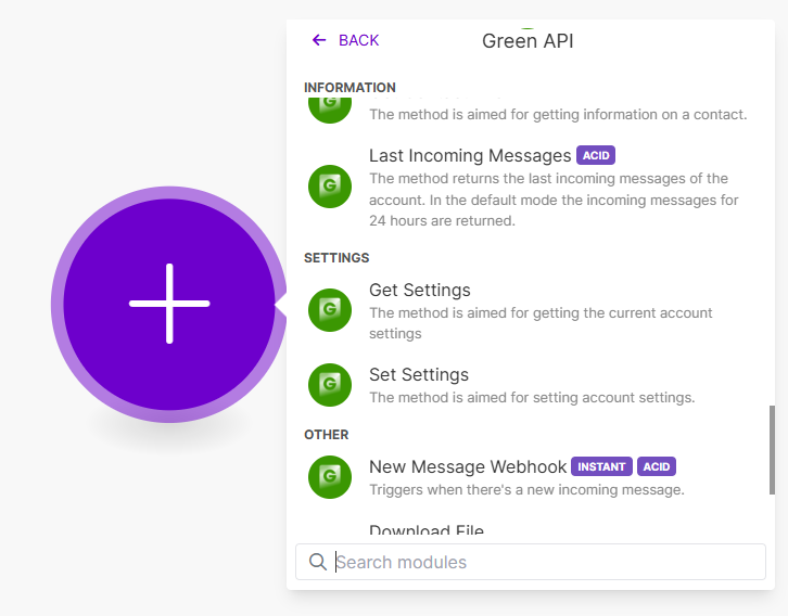 Для каждого приложения в Make реализовано большое количество действий. Например, в приложении GREEN-API все действия повторяют методы сервиса, подробнее о которых можно прочитать в нашей документации.